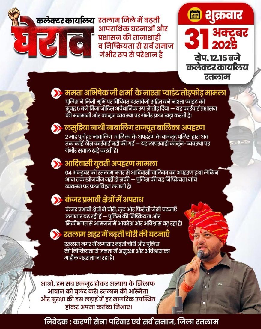 रतलाम कलेक्टर का आदेश: दो माह तक बिना अनुमति रैली-जुलूस पर प्रतिबंध : 31 को करणी सेना के आंदोलन पर नजरें टिकीं