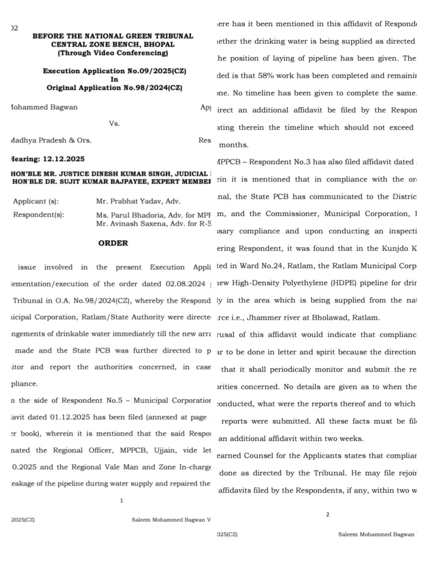 सुनवाई के दौरान ट्रिब्यूनल ने पाया कि अपने पूर्व आदेश दिनांक 02 अगस्त 2024 के बावजूद नगर निगम यह स्पष्ट नहीं कर सका कि रतलाम शहर में वास्तव में शुद्ध एवं सुरक्षित पेयजल की आपूर्ति हो रही है या नहीं।
