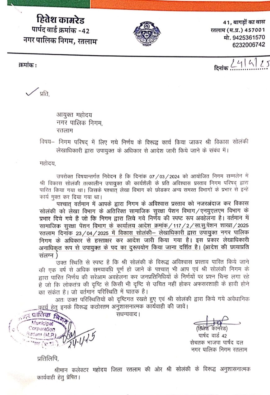 कमिश्नर द्वारा निगम के अविश्वास प्रस्ताव को नजरअंदाज कर विकास सोलंकी को लेखा विभाग के अतिरिक्त सामाजिक सुरक्षा पेंशन विभाग/एनयुएलएम विभाग के प्रभार दिये गये है जो कि निगम द्वारा लिये गये निर्णय की स्पष्ट रूप अवहेलना है। वर्तमान में सामाजिक सुरक्षा पेंशन विभाग के कार्यालय आदेश क्रमांक/117/2/सा.सु. पेंशन शाखा / 2025 रतलाम दिनांक 23/04/2025 में विकास सोलंकी- लेखाधिकारी द्वारा उपायुक्त नगर पालिक निगम के अधिकार से हस्ताक्षर कर आदेश जारी किया गया है। इस प्रकार लेखाधिकारी अनाधिकृत रूप से उपायुक्त के पद का दुरूपयोग किया जाना दर्शित है।